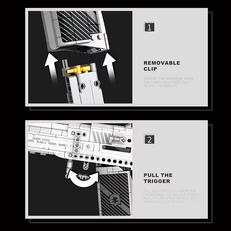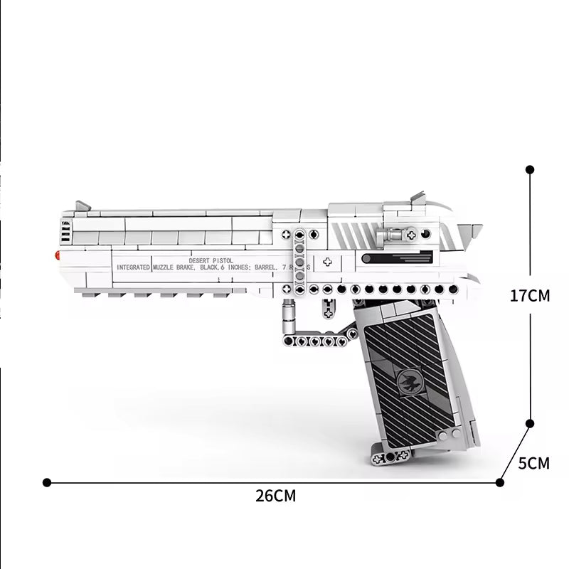 1:1 scale Desert Eagle — built from 408 pieces and compatible with bricks from other brands. This hand-operated pistol model recreates the legendary hand cannon with a working firing mechanism: sliding sleeve, detachable magazine, and dual-shot capability. At 30 x 7 x 22.5 cm, every iconic detail is captured — from the triangular barrel to the aggressive grip. The most powerful semi-auto pistol — now in brick form.