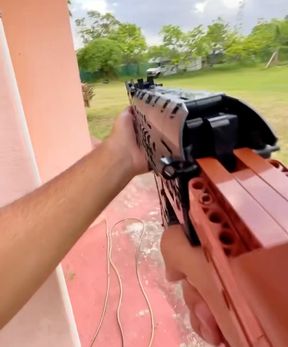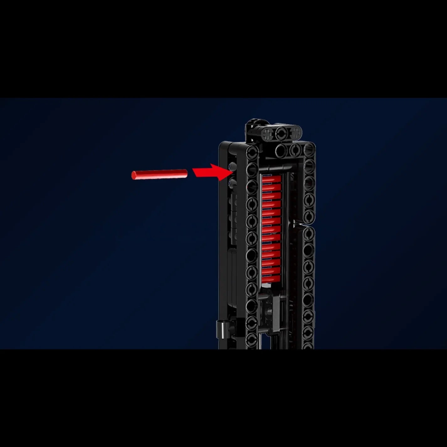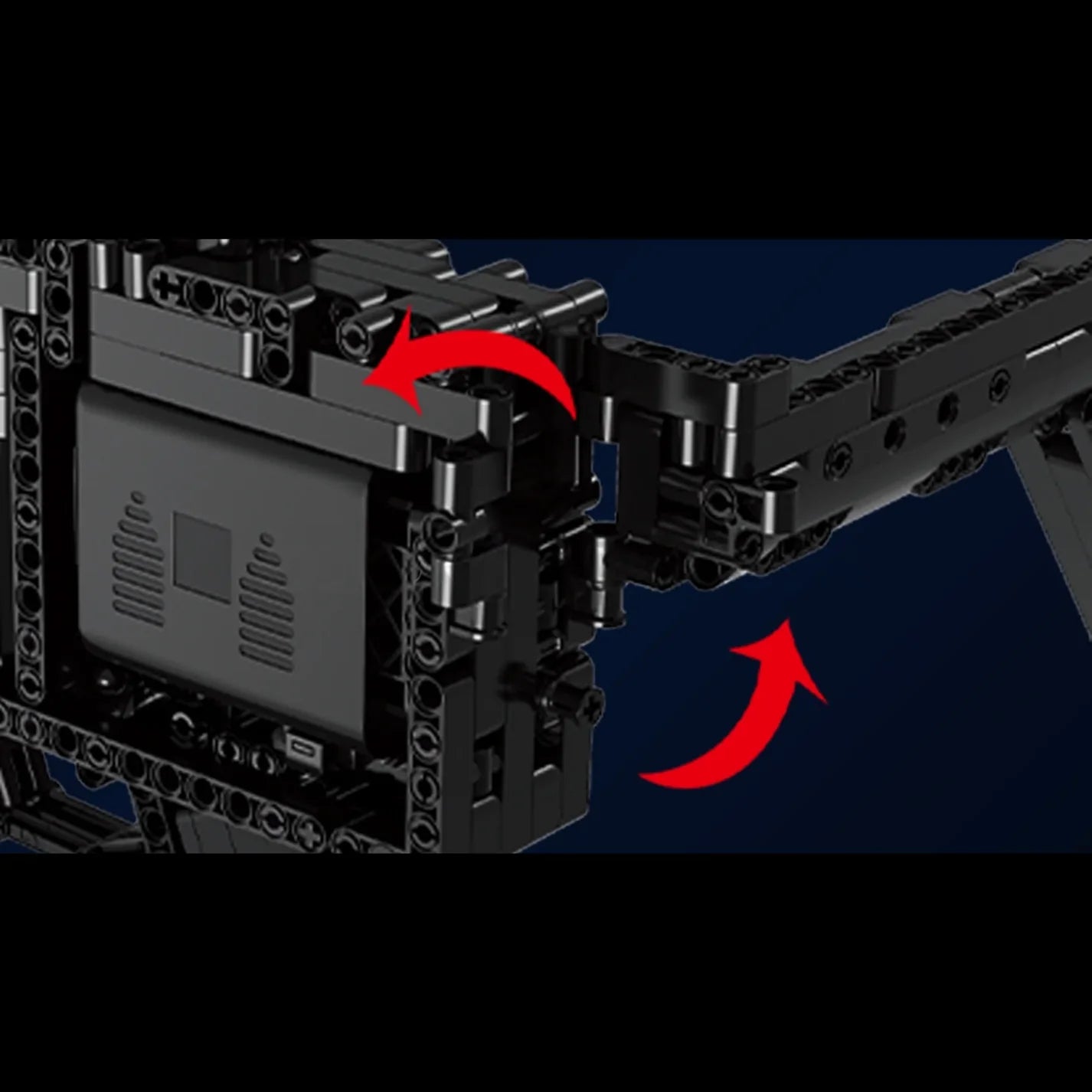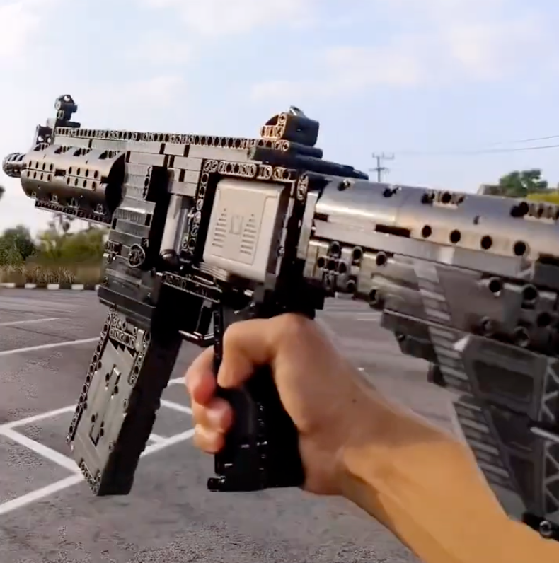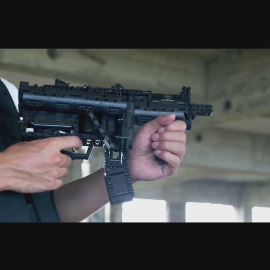 1:1 scale Heckler & Koch MP5 — built from 783 pieces and compatible with bricks from other brands. This motorized model features electric burst fire with a 13-round rapid capability, quick-release battery box, and realistic mechanics: insert magazine, pull trigger, watch it fire. The collapsible stock actually folds. Measuring 50 x 31 x 7.2 cm, it's the counter-terrorist classic — now with motor-powered action.